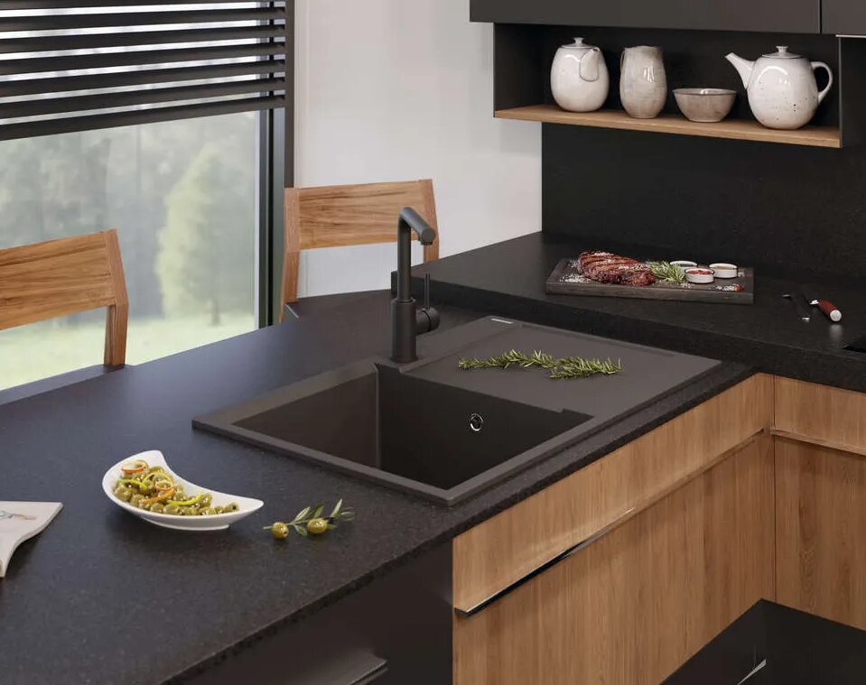 - Помимо гранита, в состав материала входит молотый кварц мельчайших размеров, которому характерны непревзойденная прочность и устойчивость к природным и химическим воздействиям. Свойства данного компонента вместе с долговечностью гранита обеспечивают мойке прочность и делают её устойчивой к любым механическим повреждениям: деформациям, сколам;