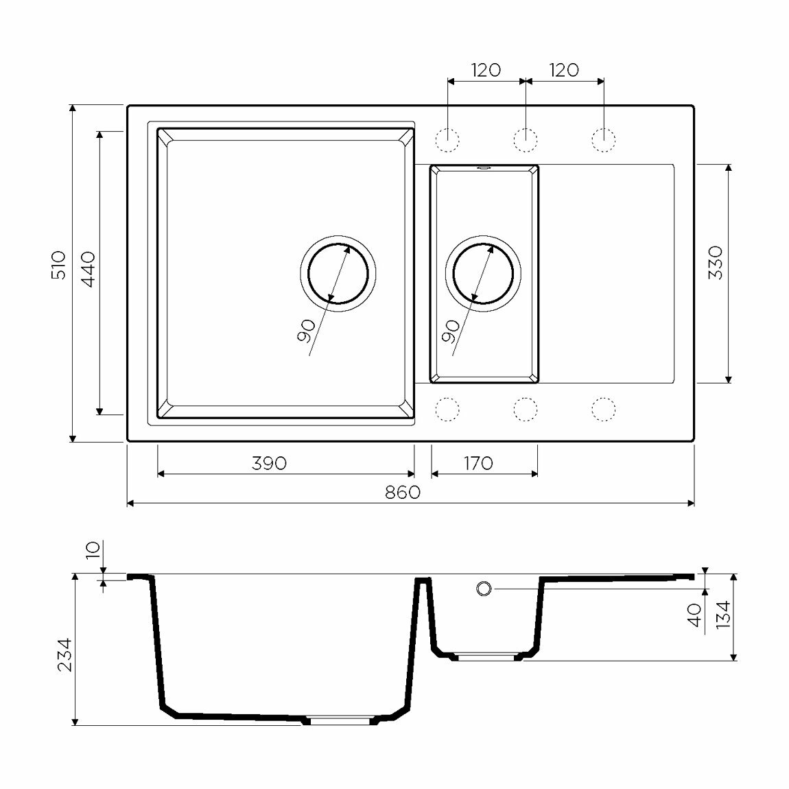 дополнительная чаша, две чаши, клапан-автомат, отверстие под смеситель, с крылом, сливная арматура
