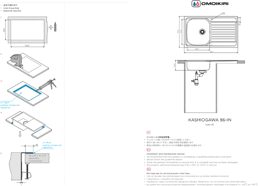 Скачать документы для Мойка Omoikiri Kashiogawa 86-IN нержавеющая сталь/нержавеющая сталь NEW 4993453