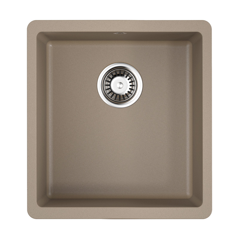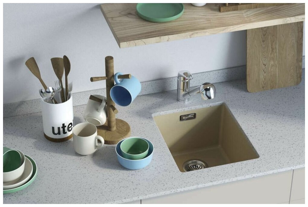 - Кухонная мойка изготовлена из матриала «Artgranit», технология производства которого заключается в том, что частицы кварца, гранита и прочного связующего полимера нового поколения, свойства которого похожи на акриловую смолу, соединяют вместе и помещают в форму. После застывания получается готовая мойка;