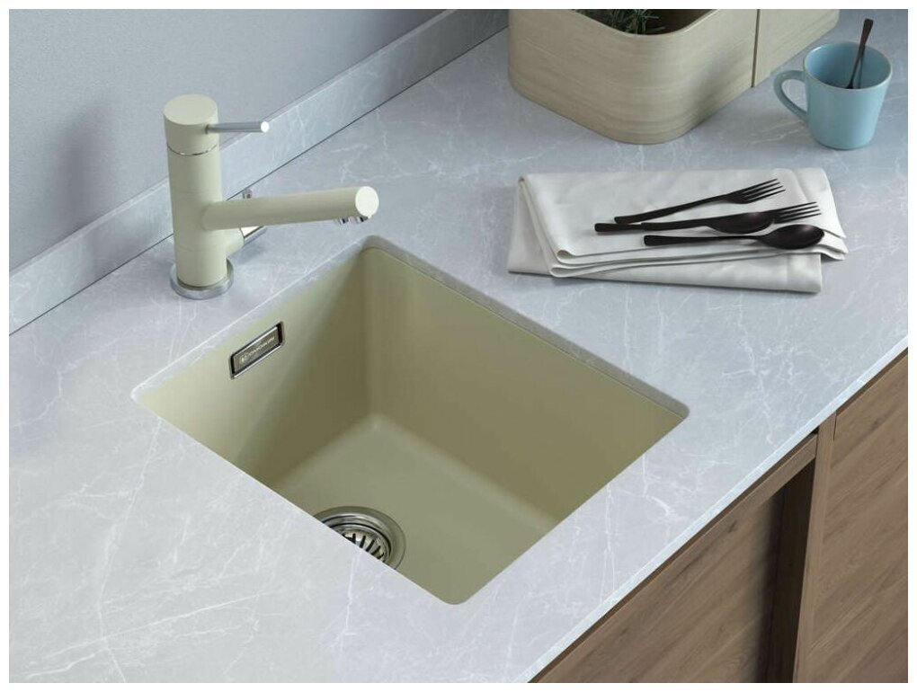 - Кухонная мойка изготовлена из матриала «Artgranit», технология производства которого заключается в том, что частицы кварца, гранита и прочного связующего полимера нового поколения, свойства которого похожи на акриловую смолу, соединяют вместе и помещают в форму. После застывания получается готовая мойка;