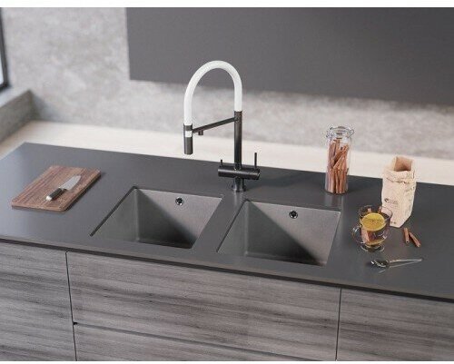 - Помимо гранита, в состав материала входит молотый кварц мельчайших размеров, которому характерны непревзойденная прочность и устойчивость к природным и химическим воздействиям. Свойства данного компонента вместе с долговечностью гранита обеспечивают мойке прочность и делают её устойчивой к любым механическим повреждениям: деформациям, сколам;