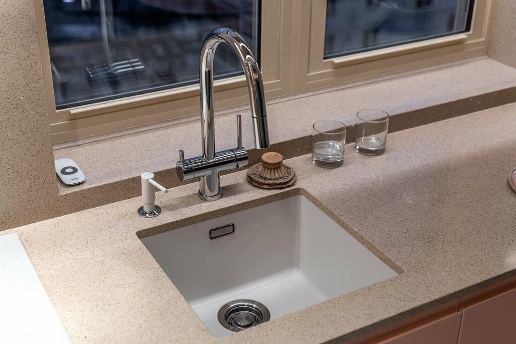 - Помимо гранита, в состав материала входит молотый кварц мельчайших размеров, которому характерны непревзойденная прочность и устойчивость к природным и химическим воздействиям. Свойства данного компонента вместе с долговечностью гранита обеспечивают мойке прочность и делают её устойчивой к любым механическим повреждениям: деформациям, сколам;