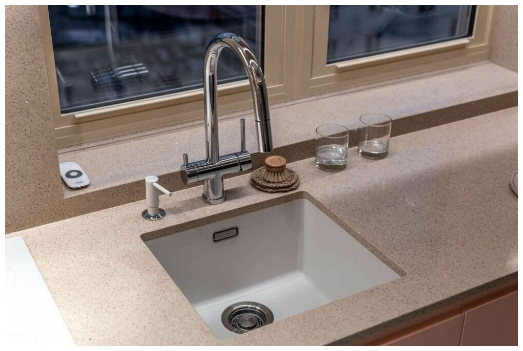 - Помимо гранита, в состав материала входит молотый кварц мельчайших размеров, которому характерны непревзойденная прочность и устойчивость к природным и химическим воздействиям. Свойства данного компонента вместе с долговечностью гранита обеспечивают мойке прочность и делают её устойчивой к любым механическим повреждениям: деформациям, сколам;