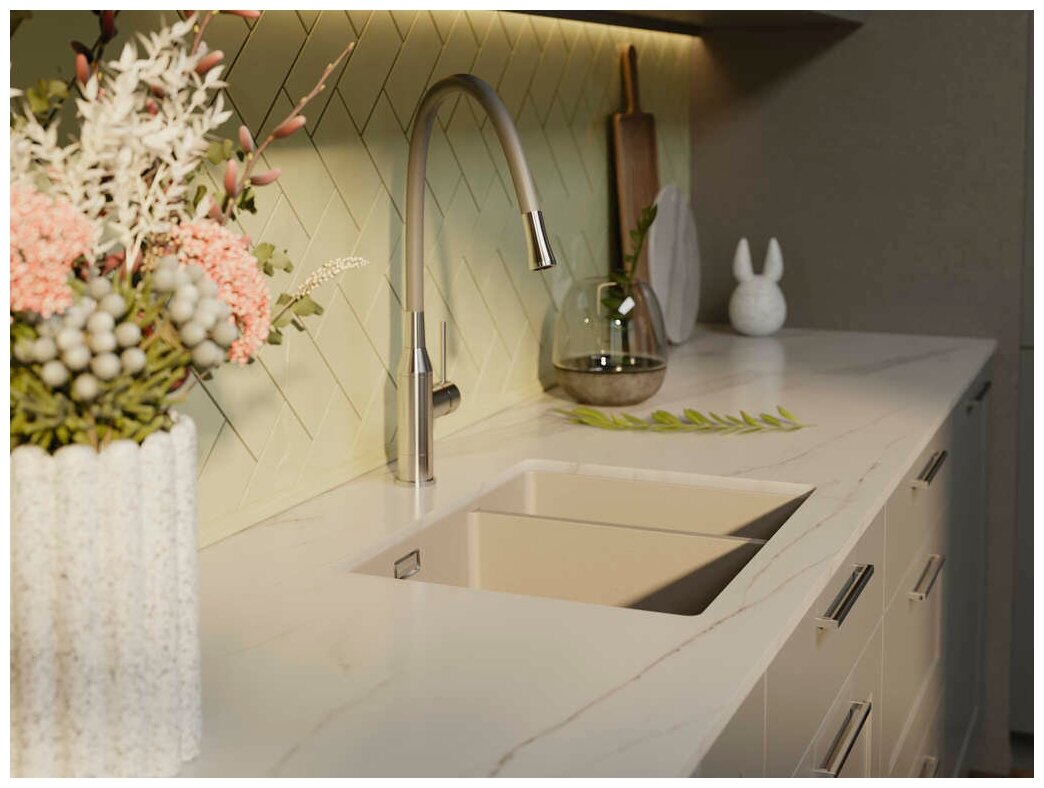 - Помимо гранита, в состав материала входит молотый кварц мельчайших размеров, которому характерны непревзойденная прочность и устойчивость к природным и химическим воздействиям. Свойства данного компонента вместе с долговечностью гранита обеспечивают мойке прочность и делают её устойчивой к любым механическим повреждениям: деформациям, сколам;