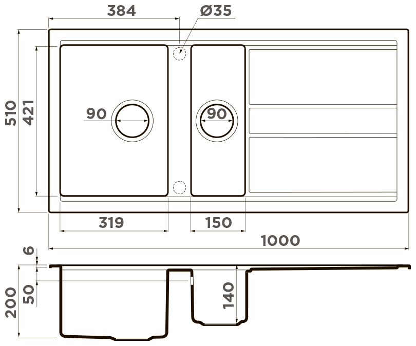 - Материал выдерживает высокие температуры до 280°С (но не стоит ставить на поверхность мойки горячие сковородки и кастрюли, т.к их температура может достигать 500°С);