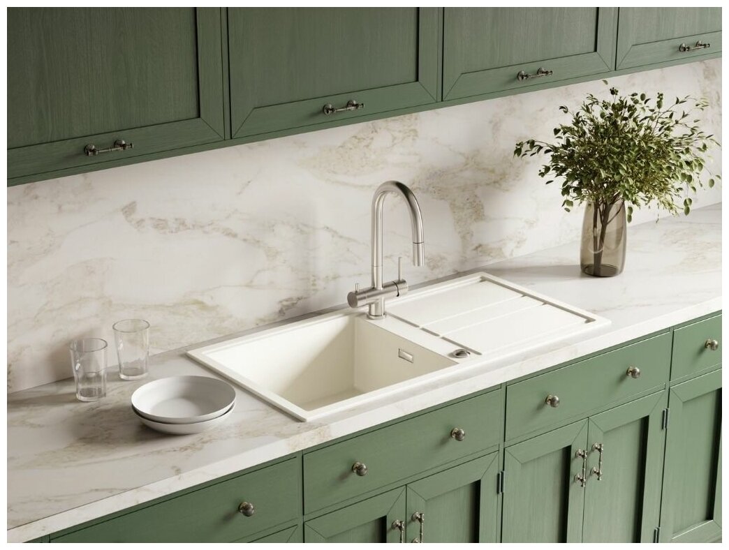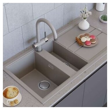 - Кухонная мойка изготовлена из передового материала «Artceramic», технология производства которого была разработана итальянскими специалистами и заключается в том, что измельченное сырье для производства керамики соединяют в пресс-форме с акриловыми смолами разного типа и нагревают с целью запуска химического процесса полимеризации (затвердевания). Важным моментом в процессе производства является использование сырья очень измельченного состояния, которое в связке с акриловой смолой образует однородную структуру с плотно прилегающими друг к другу молекулами. Структура, изготовленная при помощи такой технологии, исключает наличие даже малейших пор между частицами материала, благодаря чему достигается идеально гладкая поверхность и гигиеничность моек;