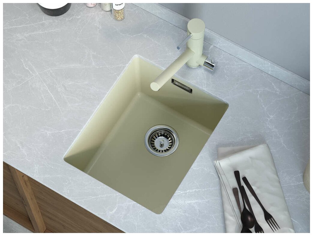 - Кухонная мойка изготовлена из матриала «Artgranit», технология производства которого заключается в том, что частицы кварца, гранита и прочного связующего полимера нового поколения, свойства которого похожи на акриловую смолу, соединяют вместе и помещают в форму. После застывания получается готовая мойка;