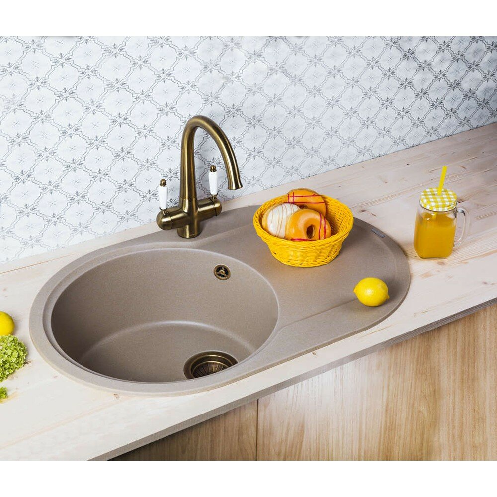 - Кухонная мойка изготовлена из матриала «Artgranit», технология производства которого заключается в том, что частицы кварца, гранита и прочного связующего полимера нового поколения, свойства которого похожи на акриловую смолу, соединяют вместе и помещают в форму. После застывания получается готовая мойка;