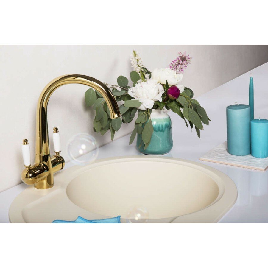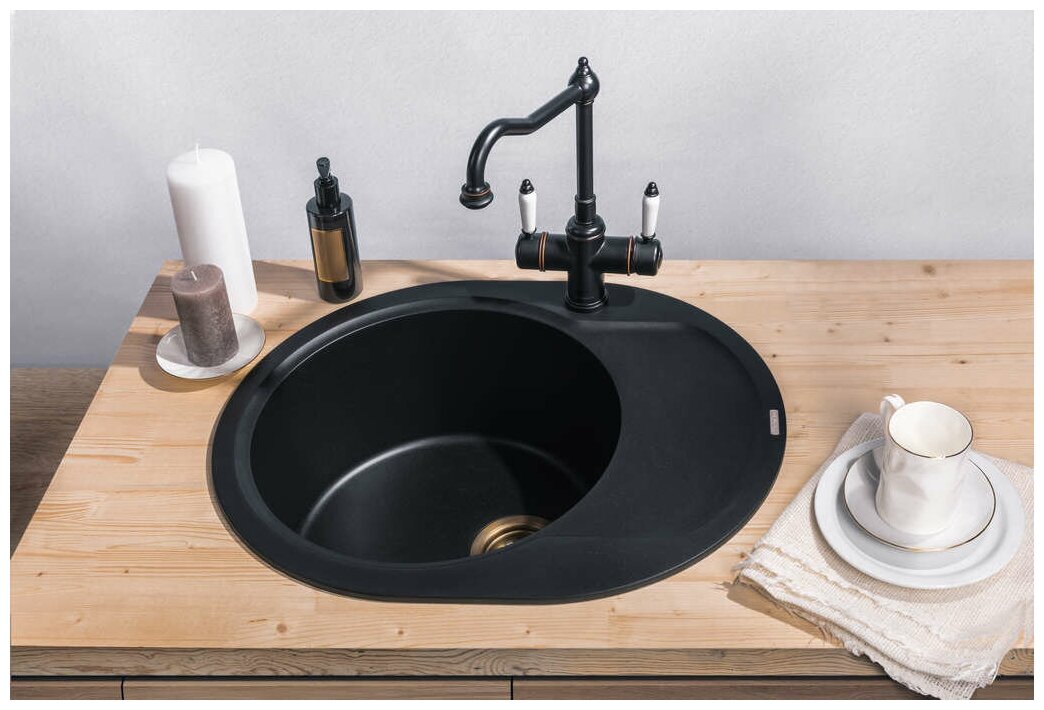 - Кухонная мойка изготовлена из матриала «Artgranit», технология производства которого заключается в том, что частицы кварца, гранита и прочного связующего полимера нового поколения, свойства которого похожи на акриловую смолу, соединяют вместе и помещают в форму. После застывания получается готовая мойка;