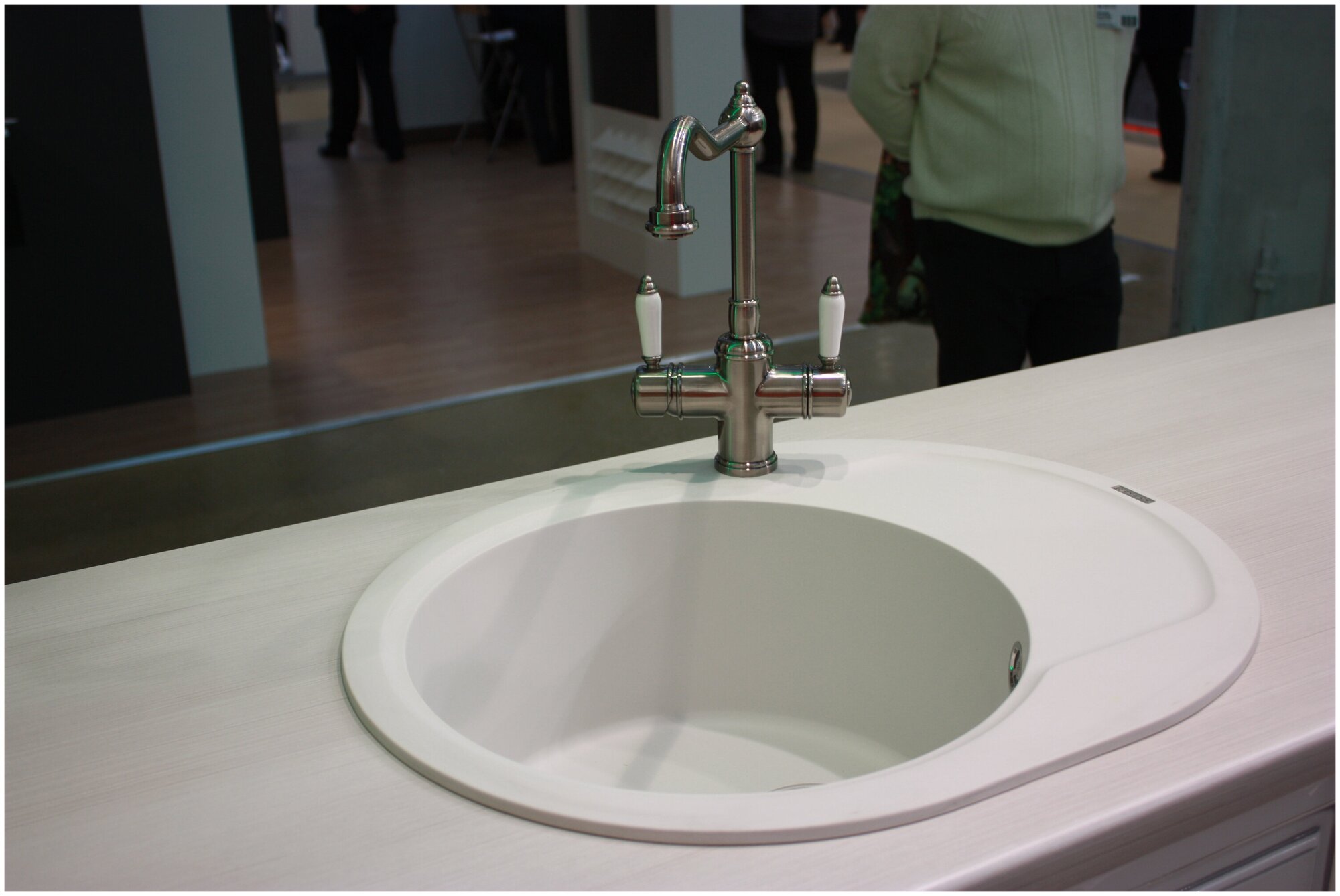 - Кухонная мойка изготовлена из матриала «Artgranit», технология производства которого заключается в том, что частицы кварца, гранита и прочного связующего полимера нового поколения, свойства которого похожи на акриловую смолу, соединяют вместе и помещают в форму. После застывания получается готовая мойка;