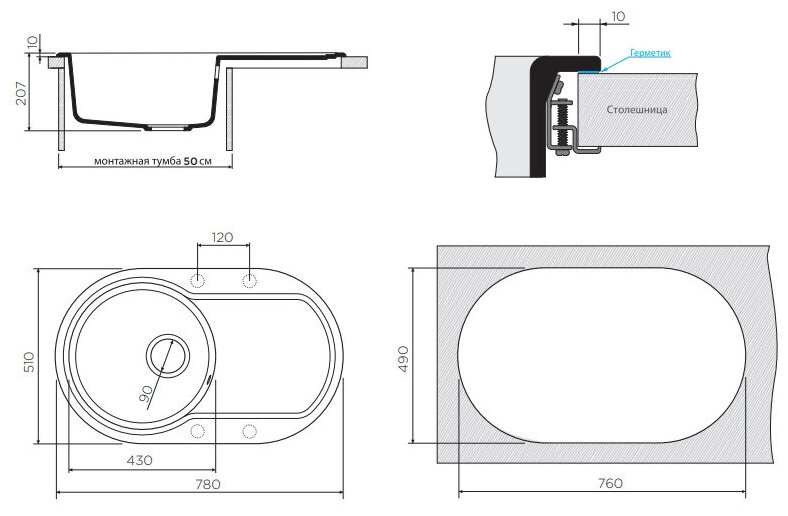 - Материал «Artgranit» выдерживает высокие температуры до 280°С (но не стоит ставить на поверхность мойки горячие сковородки и кастрюли, т.к их температура может достигать 500°С).