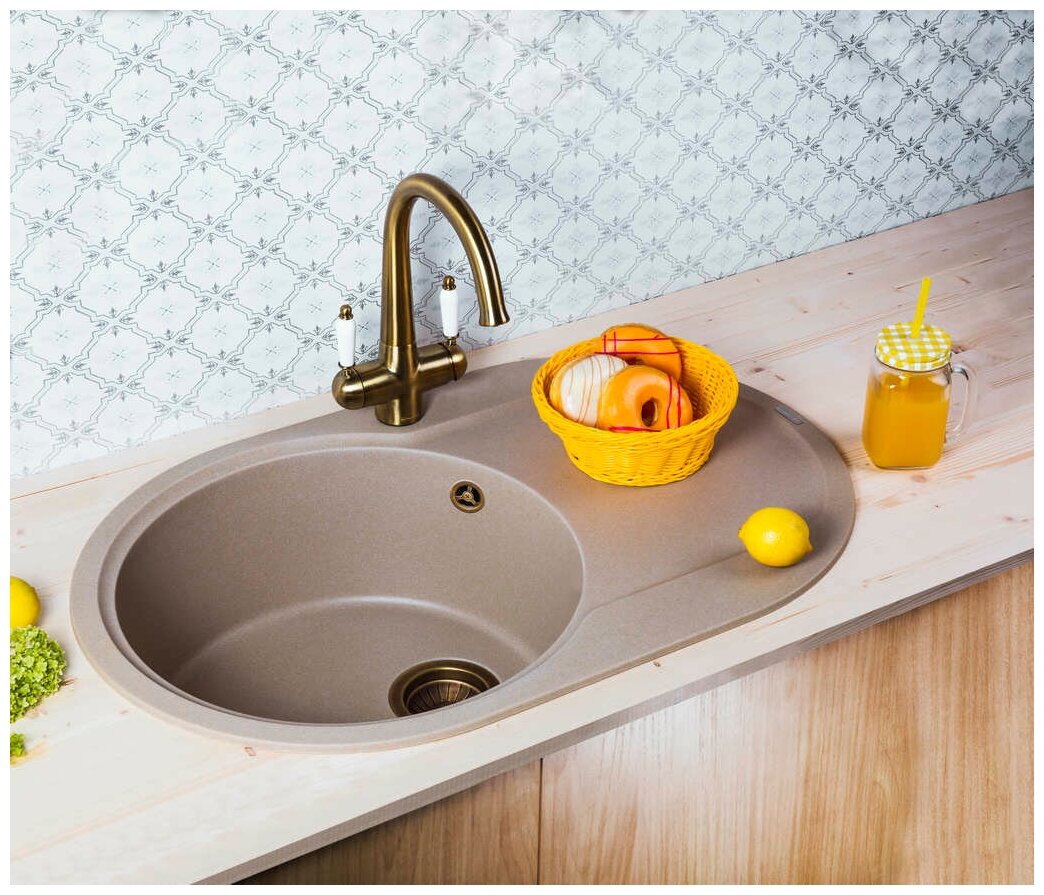- Кухонная мойка изготовлена из матриала «Artgranit», технология производства которого заключается в том, что частицы кварца, гранита и прочного связующего полимера нового поколения, свойства которого похожи на акриловую смолу, соединяют вместе и помещают в форму. После застывания получается готовая мойка;
