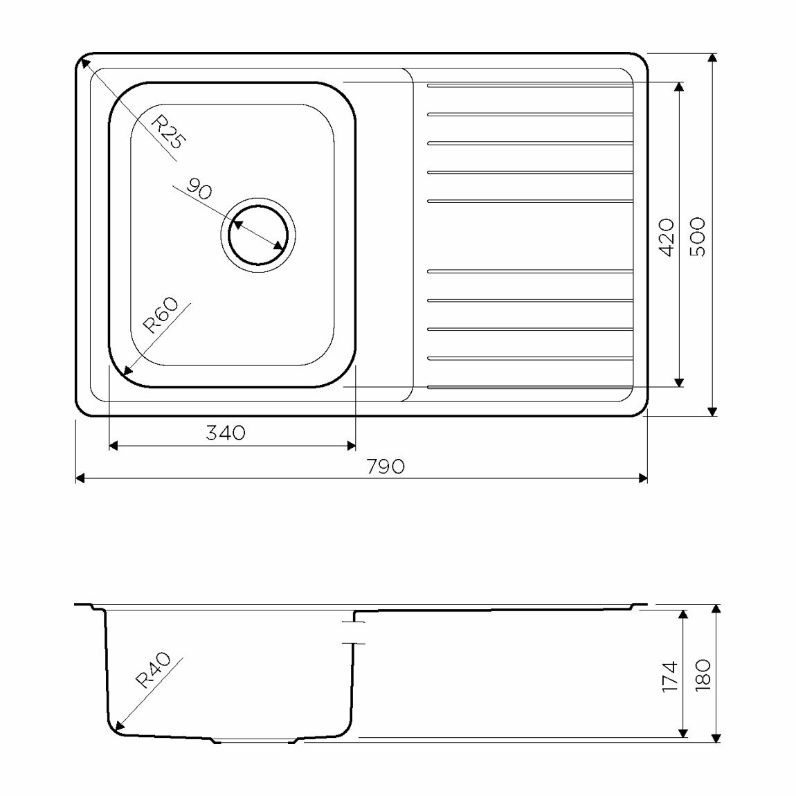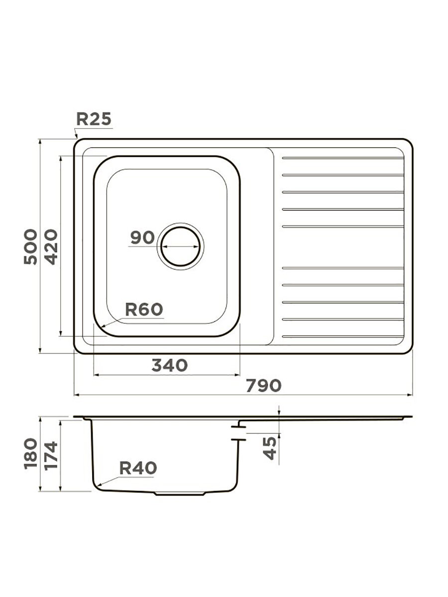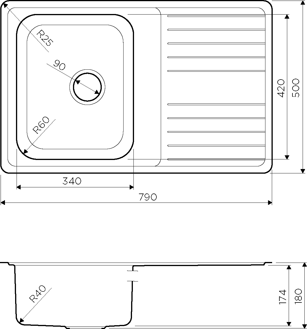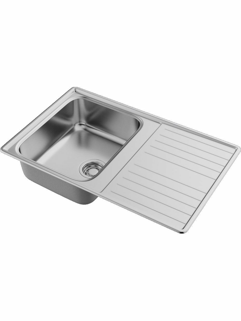 комплект поставки: мойка, сливная арматура с корзинчатым вентилем 3 1/2", сифон с возможностью дополнительного подключения посуд/стир. машины, комплект креплений; толщина материала 0.9 мм; монтажная длина - 48 см; монтажная ширина - 77 см