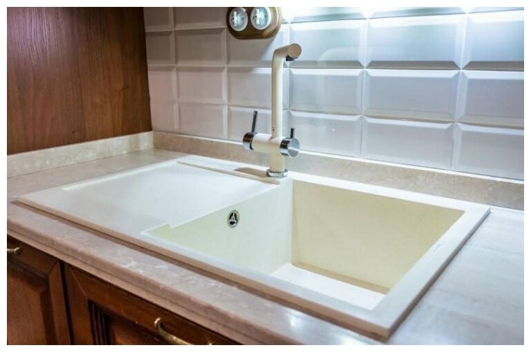 - Материал выдерживает высокие температуры до 280°С (но не стоит ставить на поверхность мойки горячие сковородки и кастрюли, т.к их температура может достигать 500°С).