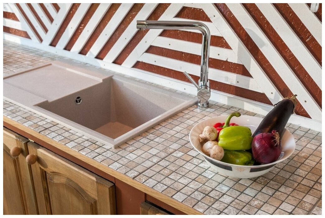 - Кухонная мойка изготовлена из матриала «Tetogranit», технология производства которого заключается в том, что частицы гранита, кварцевый песок и акриловую смолу объединяют в пресс-форме и обжигают при высокой температуре. Далее, для обеззараживания поверхности добавляют ионы серебра и волокна теторона (Tetoron), благодаря которым, на всём протяжении эксплуатации моек не происходит развитие бактерий, плесени и грибка. Также, при изготовлении моек из «Tetogranit» применяется специальный способ окрашивания частиц гранита: на их поверхность при температуре выше 700°С наносится пигмент, который за счет высокотемпературного нанесения проникает во внутренние структуры камня;