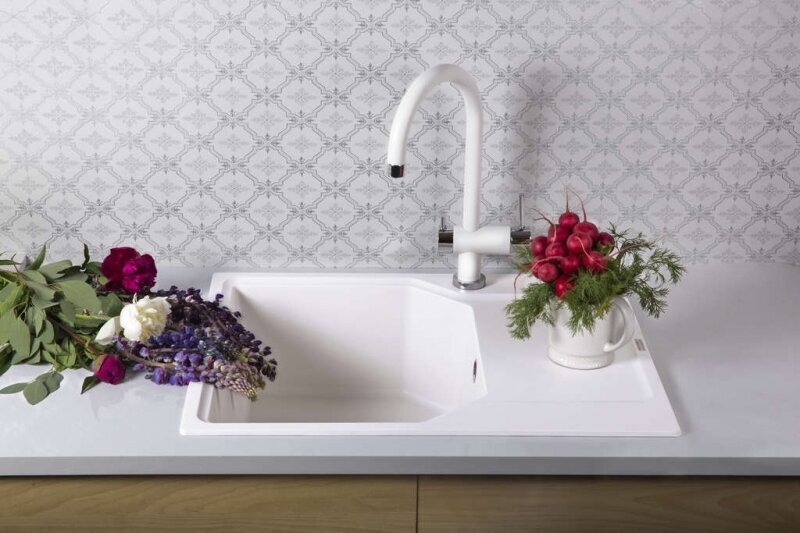 - Материал выдерживает высокие температуры до 280°С (но не стоит ставить на поверхность мойки горячие сковородки и кастрюли, т.к их температура может достигать 500°С).