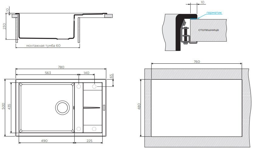 - Материал выдерживает высокие температуры до 280°С (но не стоит ставить на поверхность мойки горячие сковородки и кастрюли, т.к их температура может достигать 500°С).
