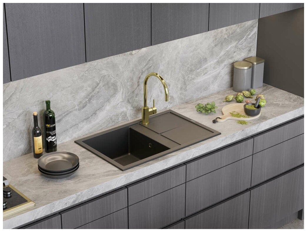 - Кухонная мойка изготовлена из матриала «Tetogranit», технология производства которого заключается в том, что частицы гранита, кварцевый песок и акриловую смолу объединяют в пресс-форме и обжигают при высокой температуре. Далее, для обеззараживания поверхности добавляют ионы серебра и волокна теторона (Tetoron), благодаря которым, на всём протяжении эксплуатации моек не происходит развитие бактерий, плесени и грибка. Также, при изготовлении моек из «Tetogranit» применяется специальный способ окрашивания частиц гранита: на их поверхность при температуре выше 700°С наносится пигмент, который за счет высокотемпературного нанесения проникает во внутренние структуры камня;