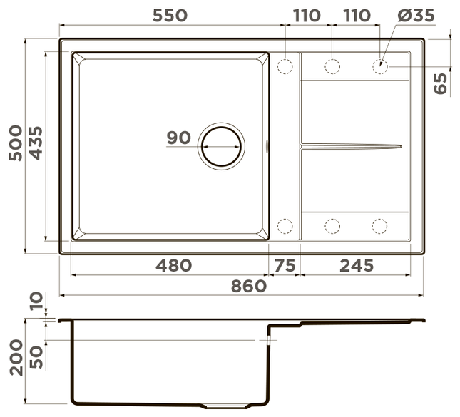 - Материал выдерживает высокие температуры до 280°С (но не стоит ставить на поверхность мойки горячие сковородки и кастрюли, т.к их температура может достигать 500°С).