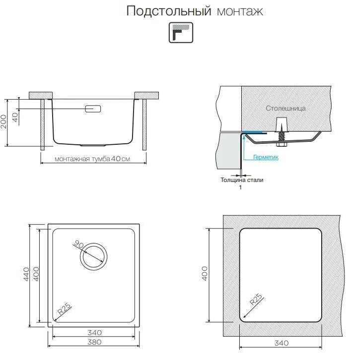 монтаж под столешницу, толщина металла 0.9 мм