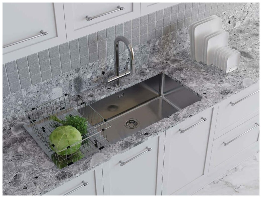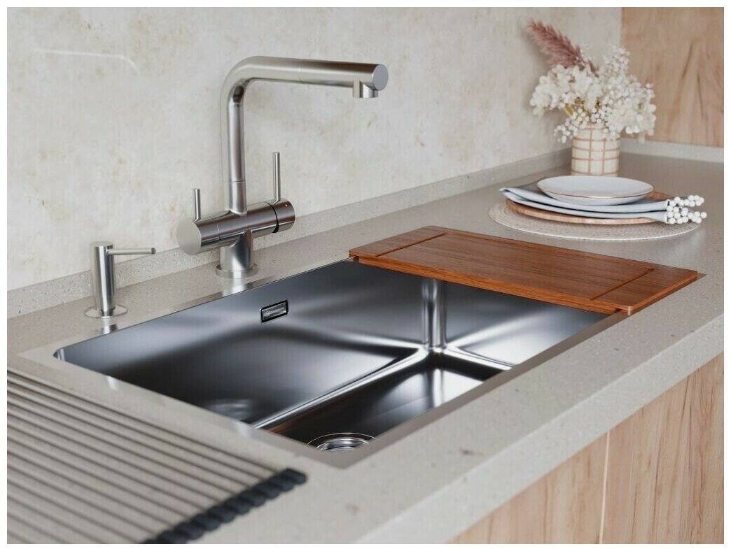 - Кухонная мойка изготовлена из высококачественной хромоникелевой нержавеющей стали SUS304. Она содержит 18% хрома и 8% никеля, что обеспечивает её максимальную защиту от коррозии;