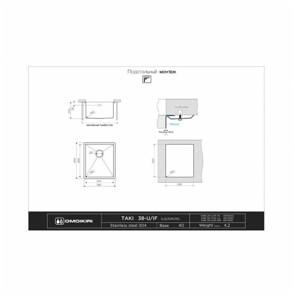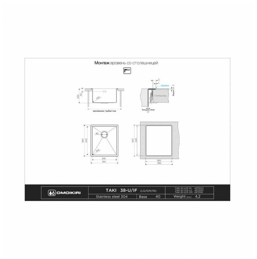 PVD покрытие, клапан-автомат, корзинчатый вентиль, отверстие под смеситель, сливная арматура, смеситель, IF-LG (арт.4973092), Крепления, Кухонная мойка OMOIKIRI Taki 38-U, гарантийный талон., донный клапан, донный клапан (автоматический донный клапан приобретается отдельно), инструкция -1 штука, крепление, крепления, мойка, перелив, сифон / донный клапан / слив / перелив / крепления, слив