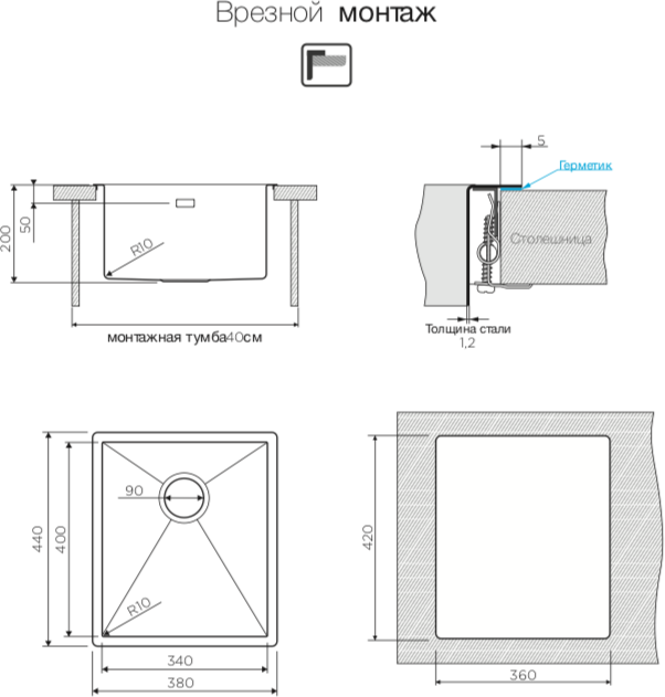 три варианта монтажа (монтаж под столешницу, монтаж вровень со столешницей, монтаж на столешницу)