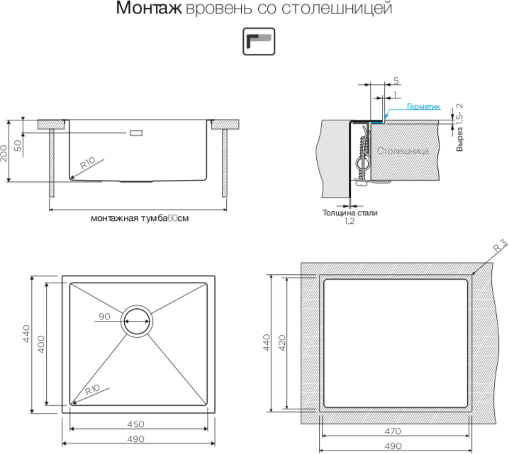 три варианта монтажа (монтаж под столешницу, монтаж вровень со столешницей, монтаж на столешницу)