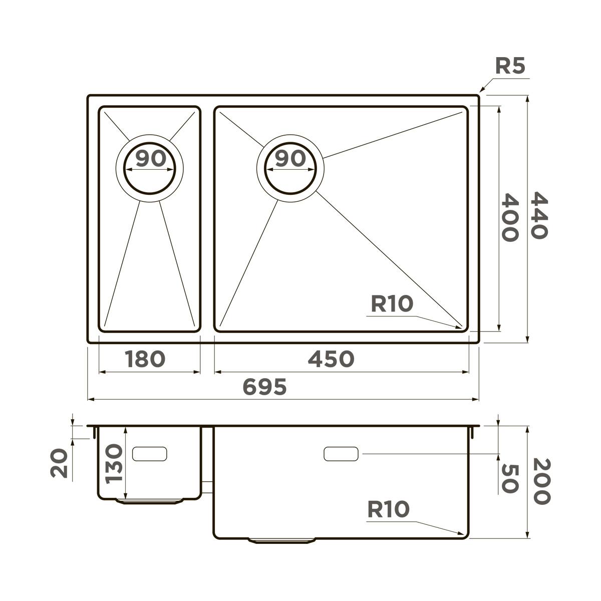- Кухонная мойка изготовлена из высококачественной хромоникелевой нержавеющей стали SUS304. Она содержит 18% хрома и 8% никеля, что обеспечивает её максимальную защиту от коррозии;