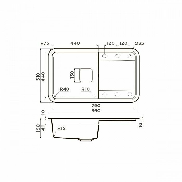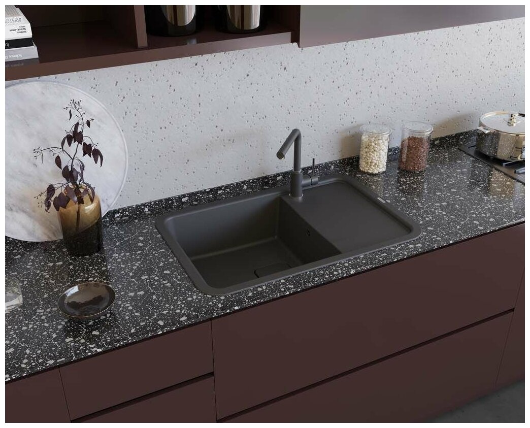 - Кухонная мойка изготовлена из матриала «Artgranit», технология производства которого заключается в том, что частицы кварца, гранита и прочного связующего полимера нового поколения, свойства которого похожи на акриловую смолу, соединяют вместе и помещают в форму. После застывания получается готовая мойка;