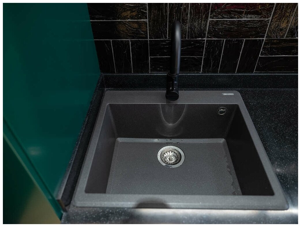 - Мойка черного цвета создана из материала «Tetogranit Metal». В его составе: акриловая смола и натуральный гранит с добавлением металлических частиц, которые придают блеск и мерцание поверхности мойки. «Tetogranit Metal» отличается максимальной устойчивостью к температурным перепадам и ударам;