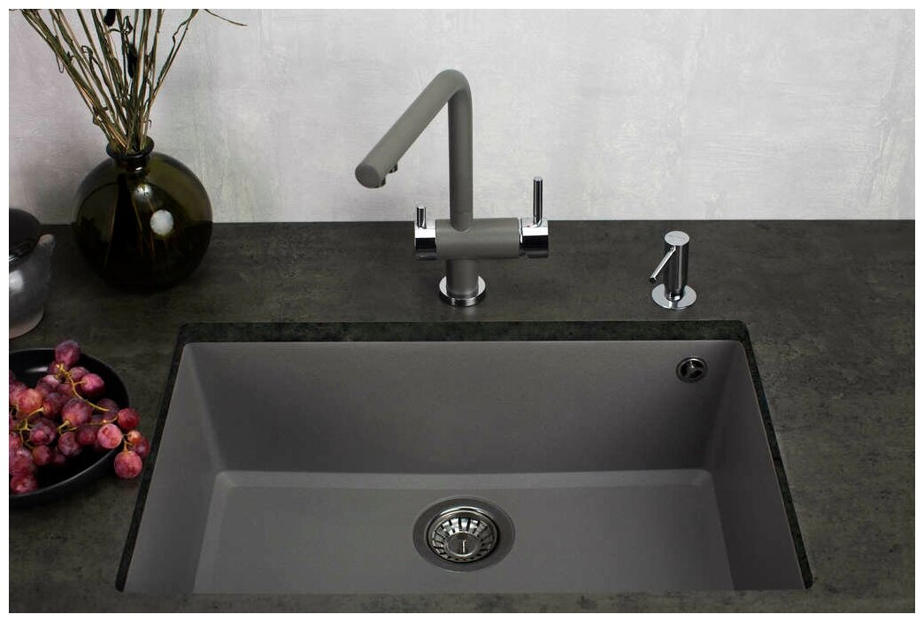 - Мойка черного цвета создана из материала «Tetogranit Metal». В его составе: акриловая смола и натуральный гранит с добавлением металлических частиц, которые придают блеск и мерцание поверхности мойки. «Tetogranit Metal» отличается максимальной устойчивостью к температурным перепадам и ударам;