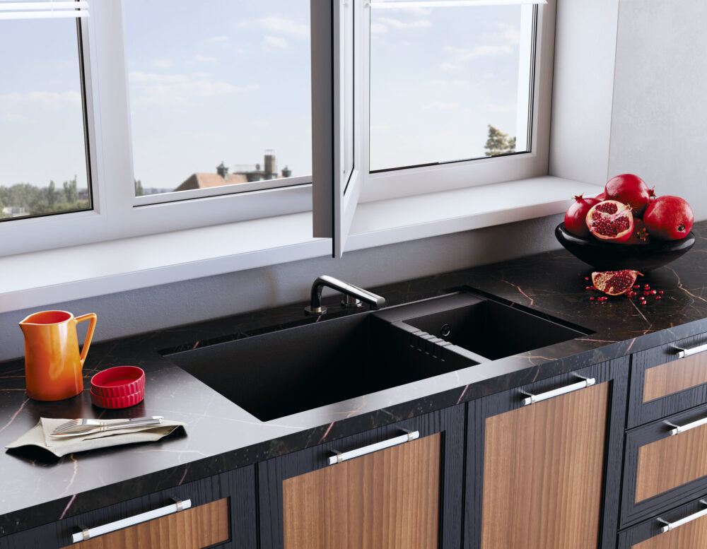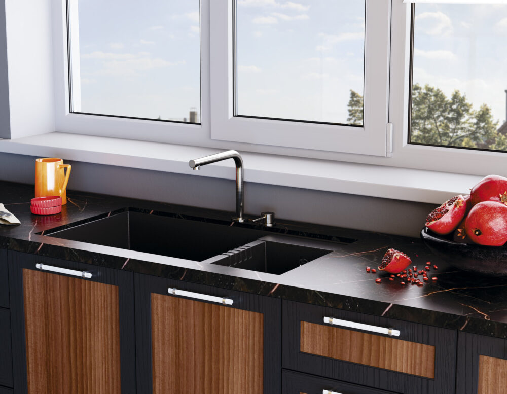 - Мойка черного цвета создана из материала «Tetogranit Metal». В его составе: акриловая смола и натуральный гранит с добавлением металлических частиц, которые придают блеск и мерцание поверхности мойки. «Tetogranit Metal» отличается максимальной устойчивостью к температурным перепадам и ударам;