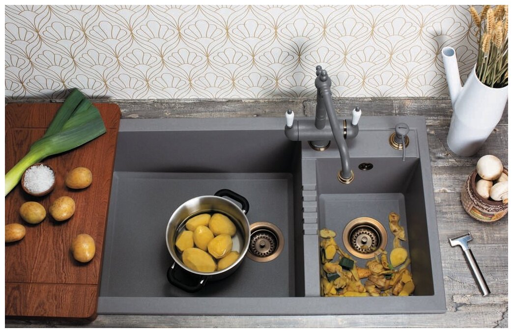 - Мойка черного цвета создана из материала «Tetogranit Metal». В его составе: акриловая смола и натуральный гранит с добавлением металлических частиц, которые придают блеск и мерцание поверхности мойки. «Tetogranit Metal» отличается максимальной устойчивостью к температурным перепадам и ударам;