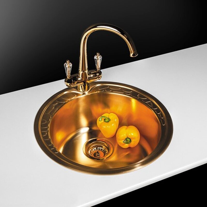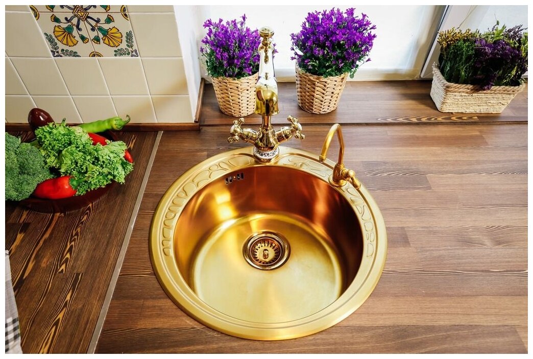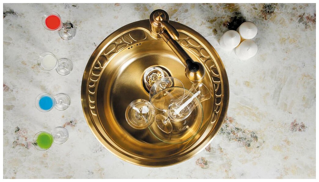 PVD покрытие, корзинчатый вентиль, отверстие под смеситель, сливная арматура, Крепления, Мойка 1 шт, гарантийный талон., донный клапан (автоматический донный клапан приобретается отдельно), перелив, слив