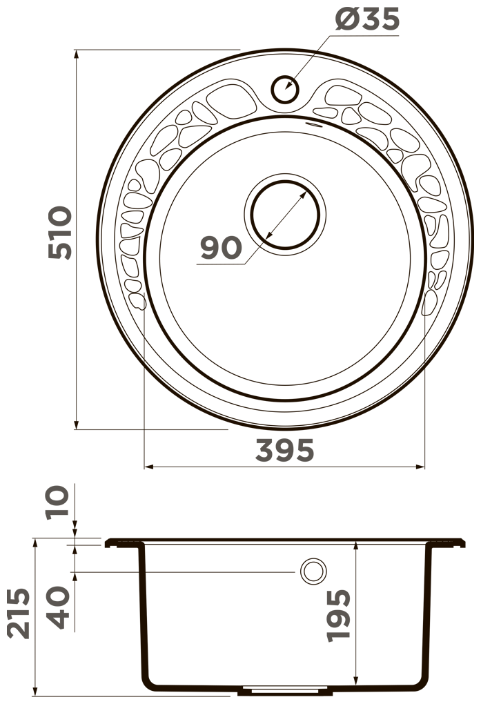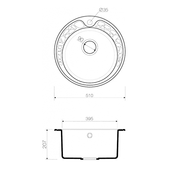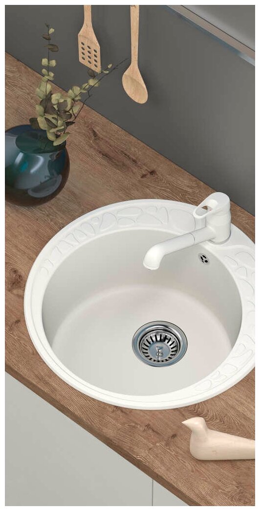 - Кухонная мойка изготовлена из матриала «Artgranit», технология производства которого заключается в том, что частицы кварца, гранита и прочного связующего полимера нового поколения, свойства которого похожи на акриловую смолу, соединяют вместе и помещают в форму. После застывания получается готовая мойка;