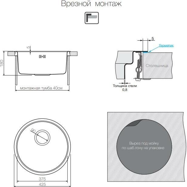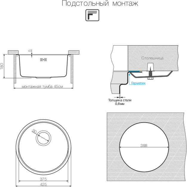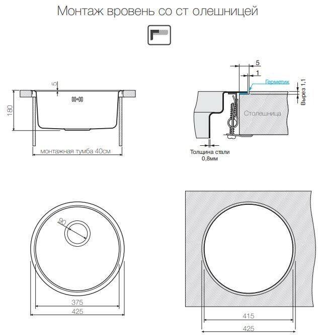 монтаж под столешницу, толщина металла 0.8 мм