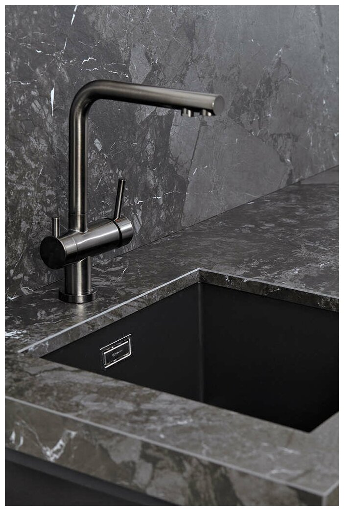 - Кухонная мойка изготовлена из передового материала «Artceramic», технология производства которого была разработана итальянскими специалистами и заключается в том, что измельченное сырье для производства керамики соединяют в пресс-форме с акриловыми смолами разного типа и нагревают с целью запуска химического процесса полимеризации (затвердевания). Важным моментом в процессе производства является использование сырья очень измельченного состояния, которое в связке с акриловой смолой образует однородную структуру с плотно прилегающими друг к другу молекулами. Структура, изготовленная при помощи такой технологии, исключает наличие даже малейших пор между частицами материала, благодаря чему достигается идеально гладкая поверхность и гигиеничность моек;