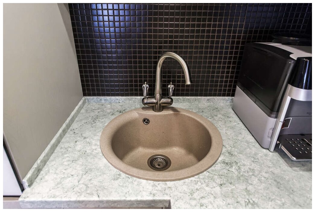 - Кухонная мойка изготовлена из матриала «Tetogranit», технология производства которого заключается в том, что частицы гранита, кварцевый песок и акриловую смолу объединяют в пресс-форме и обжигают при высокой температуре. Далее, для обеззараживания поверхности добавляют ионы серебра и волокна теторона (Tetoron), благодаря которым, на всём протяжении эксплуатации моек не происходит развитие бактерий, плесени и грибка. Также, при изготовлении моек из «Tetogranit» применяется специальный способ окрашивания частиц гранита: на их поверхность при температуре выше 700°С наносится пигмент, который за счет высокотемпературного нанесения проникает во внутренние структуры камня;