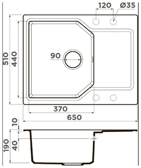- Кухонная мойка изготовлена из матриала «Artgranit», технология производства которого заключается в том, что частицы кварца, гранита и прочного связующего полимера нового поколения, свойства которого похожи на акриловую смолу, соединяют вместе и помещают в форму. После застывания получается готовая мойка;