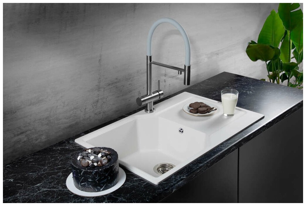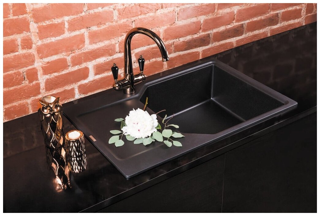 - Кухонная мойка изготовлена из матриала «Artgranit», технология производства которого заключается в том, что частицы кварца, гранита и прочного связующего полимера нового поколения, свойства которого похожи на акриловую смолу, соединяют вместе и помещают в форму. После застывания получается готовая мойка;