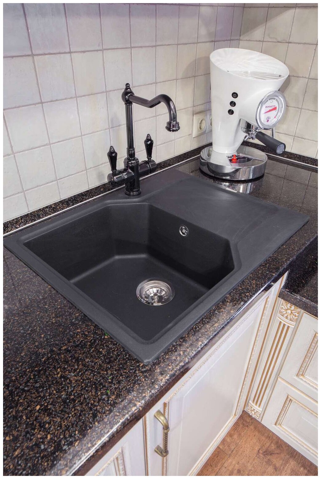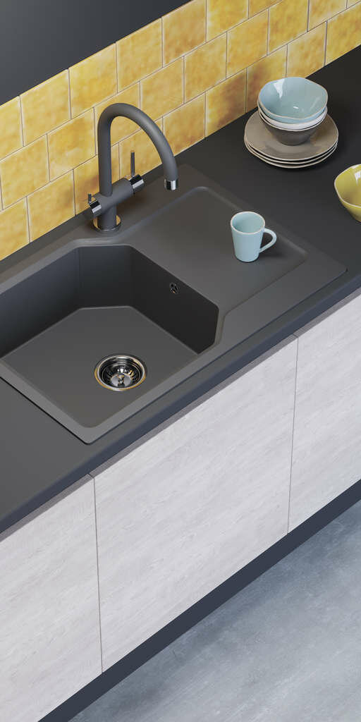 - Кухонная мойка изготовлена из матриала «Artgranit», технология производства которого заключается в том, что частицы кварца, гранита и прочного связующего полимера нового поколения, свойства которого похожи на акриловую смолу, соединяют вместе и помещают в форму. После застывания получается готовая мойка;