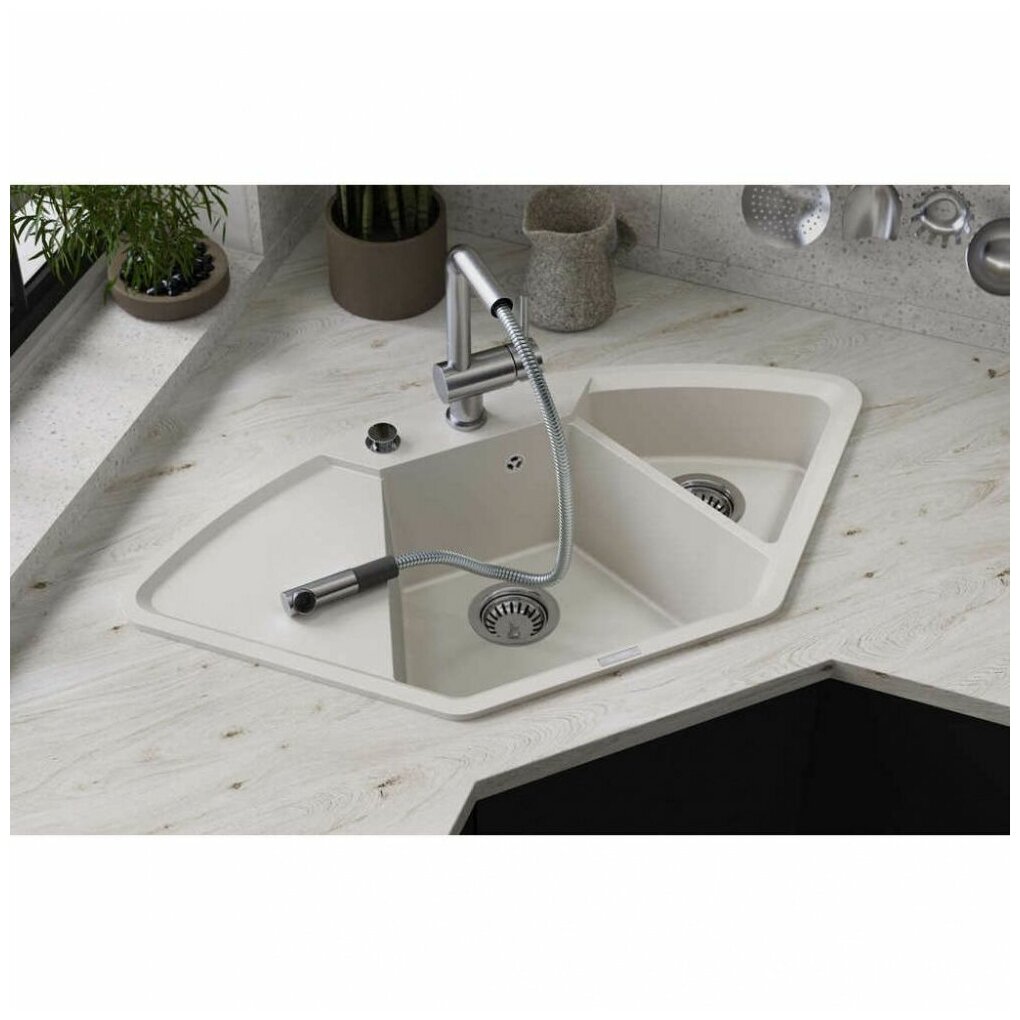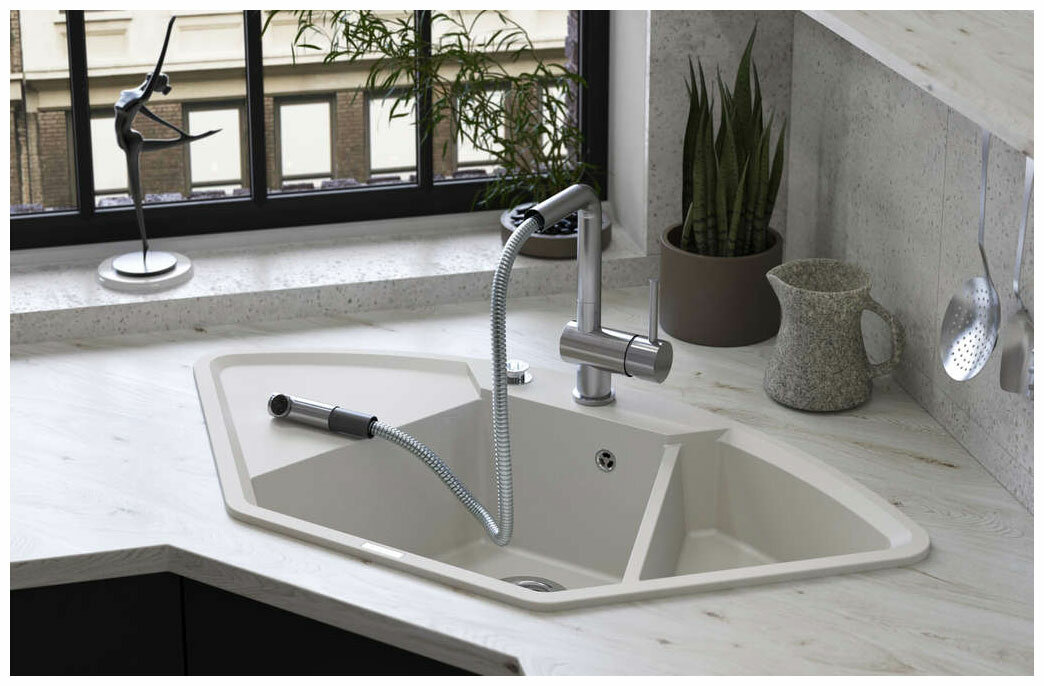 - Кухонная мойка изготовлена из матриала «Artgranit», технология производства которого заключается в том, что частицы кварца, гранита и прочного связующего полимера нового поколения, свойства которого похожи на акриловую смолу, соединяют вместе и помещают в форму. После застывания получается готовая мойка;