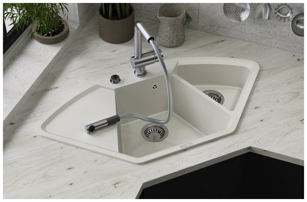 - Кухонная мойка изготовлена из матриала «Artgranit», технология производства которого заключается в том, что частицы кварца, гранита и прочного связующего полимера нового поколения, свойства которого похожи на акриловую смолу, соединяют вместе и помещают в форму. После застывания получается готовая мойка;