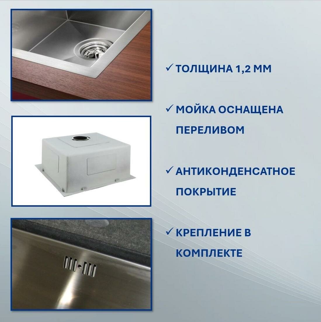 поверхность сатиновая; толщина стали 1.0 мм; размер сливного отверстия 90 мм