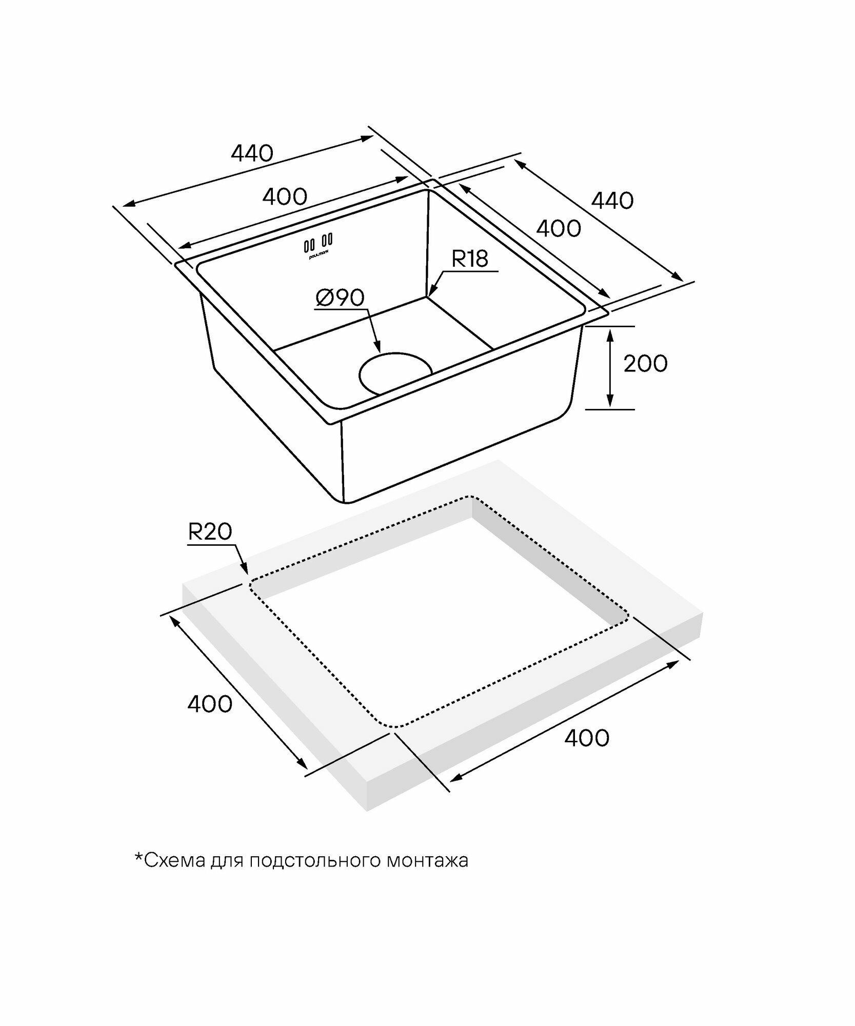 толщина мойки 1,2 мм, диаметр слива 114 мм; в комплекте сифон, крепеж для монтажа