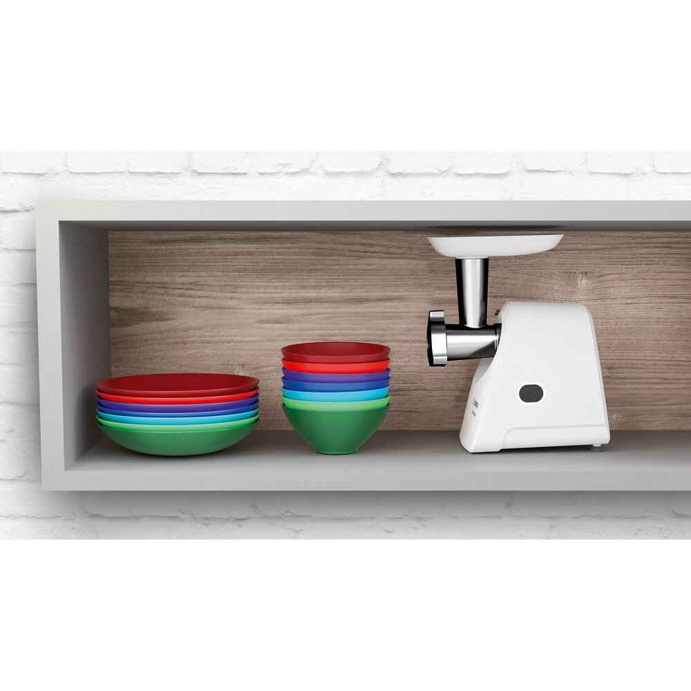 защита от перегрузки, мытье в посудомоечной машине, отсек для сетевого шнура, отсек для хранения насадок, прорезиненные ножки, самозатачивающийся нож, Защита от перегрузки (автоматический предохранитель), Номинальная мощность 350Вт.2 перфорированных диска для фарша 3.8 мм и 8 мм, защита двигателя от перегрузки, насадка-соковыжималка шнековая., насадки для приготовления колбас, толкатель