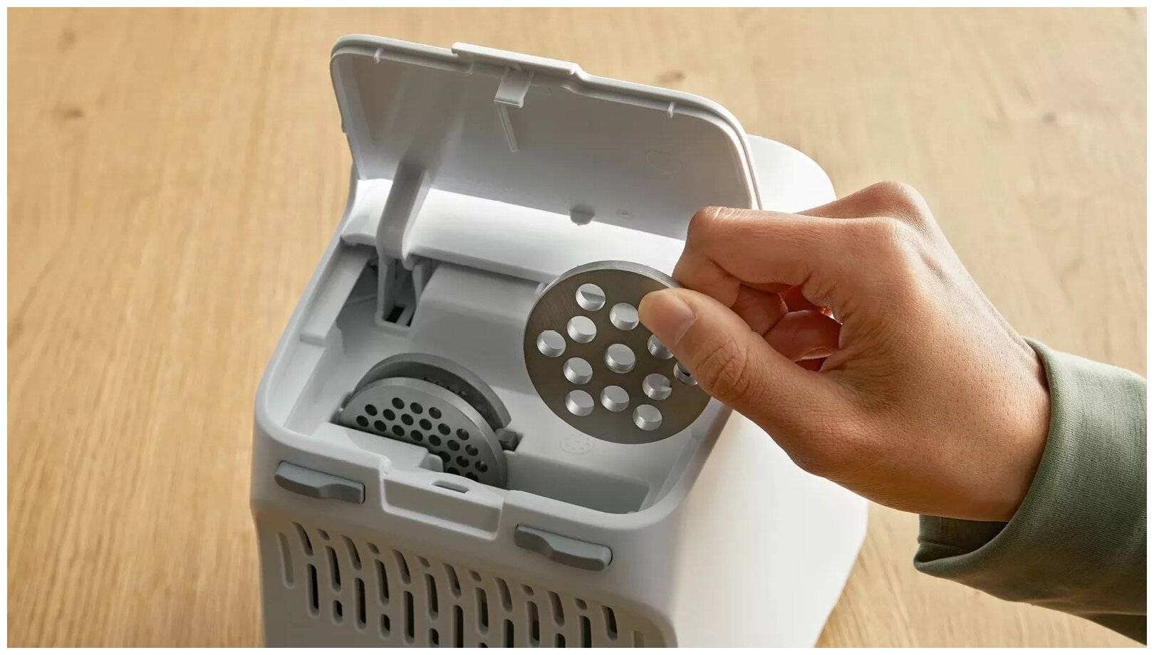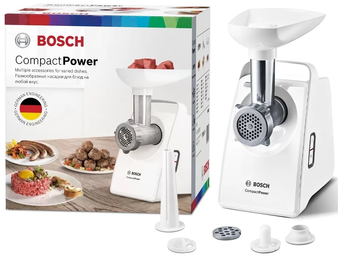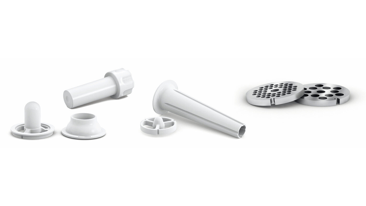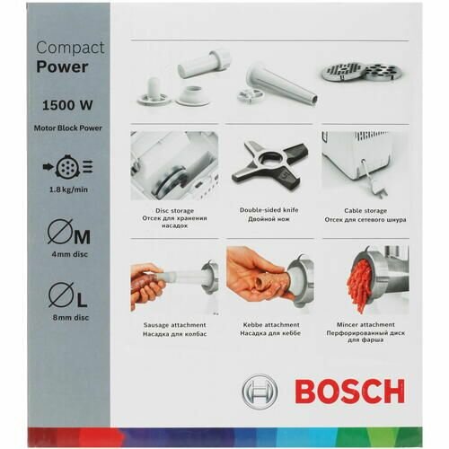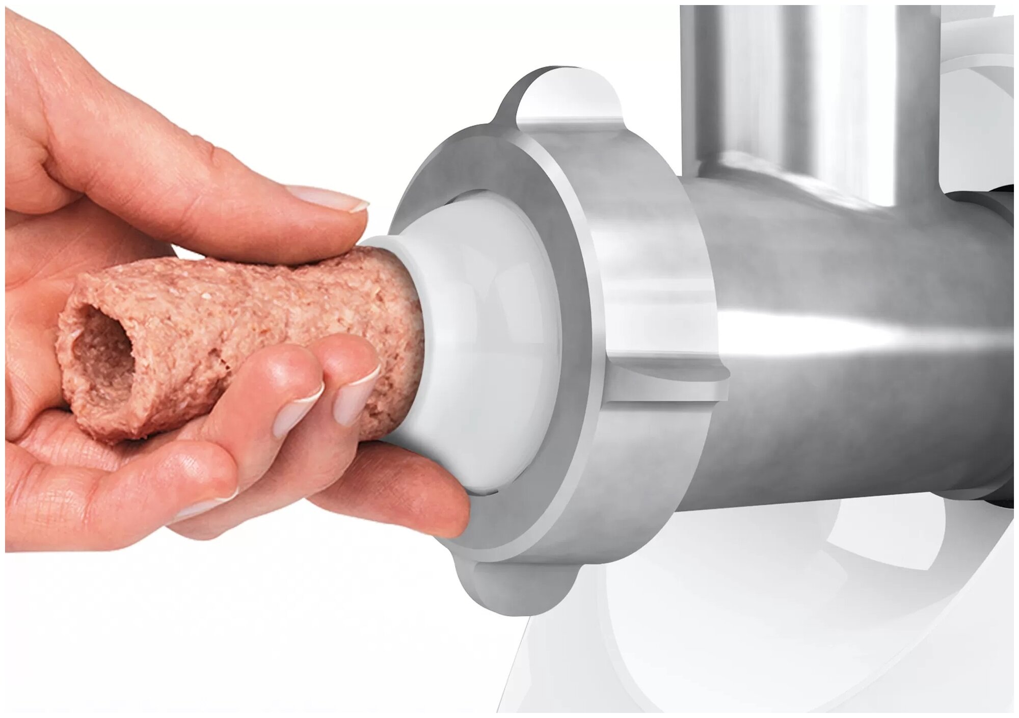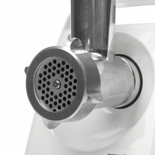 защита от перегрузки, мытье в посудомоечной машине, отсек для сетевого шнура, отсек для хранения насадок, прорезиненные ножки, Защита от перегрузки (автоматический предохранитель), Номинальная мощность 500вт, защита двигателя от перегрузки, насадки для приготовления колбас, отсек для хранения насадок, отсек для сетевого шнура, прорезиненные ножки, защита от перегрузки, ручка для переноски, толкатель