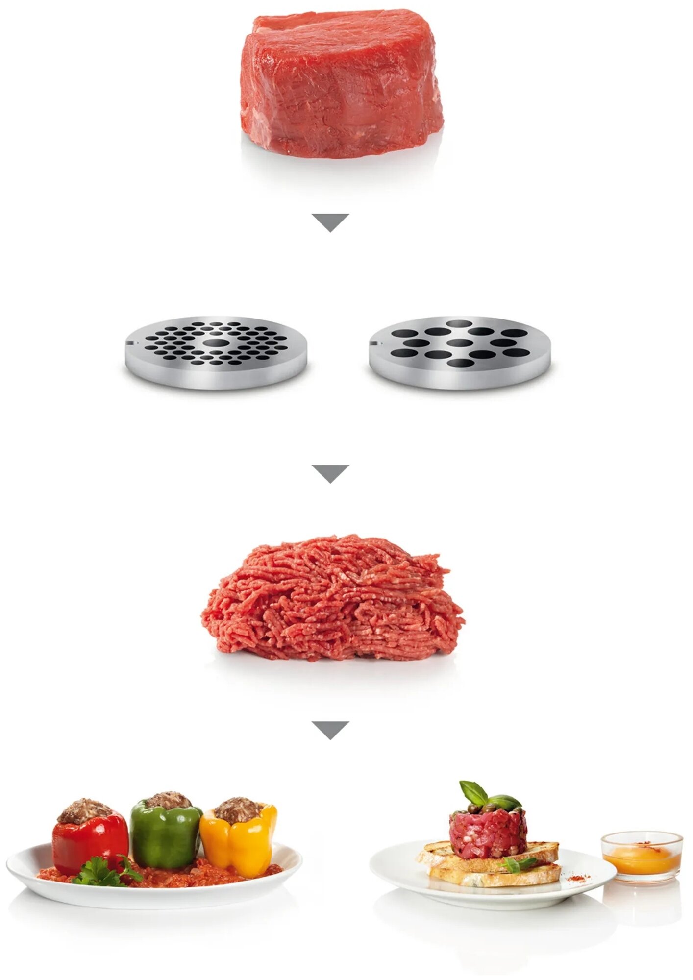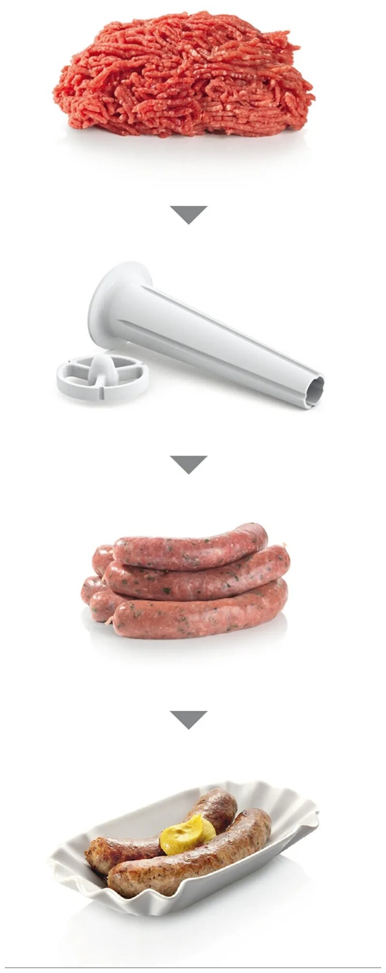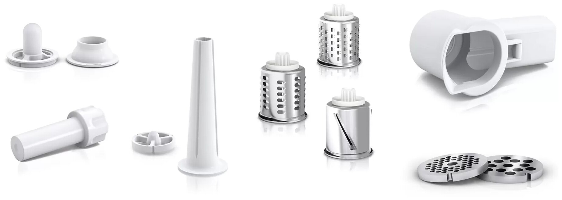 диск для фарша, насадка для кеббе, насадка для приготовления колбас, насадка для шинковки, насадка-терка, 3 решетки, Насадка-овощерезка, барабан для нарезки, для кеббе, для колбасок, для набивки сосисок и колбас, для приготовления колбас, для шинковки овощей
